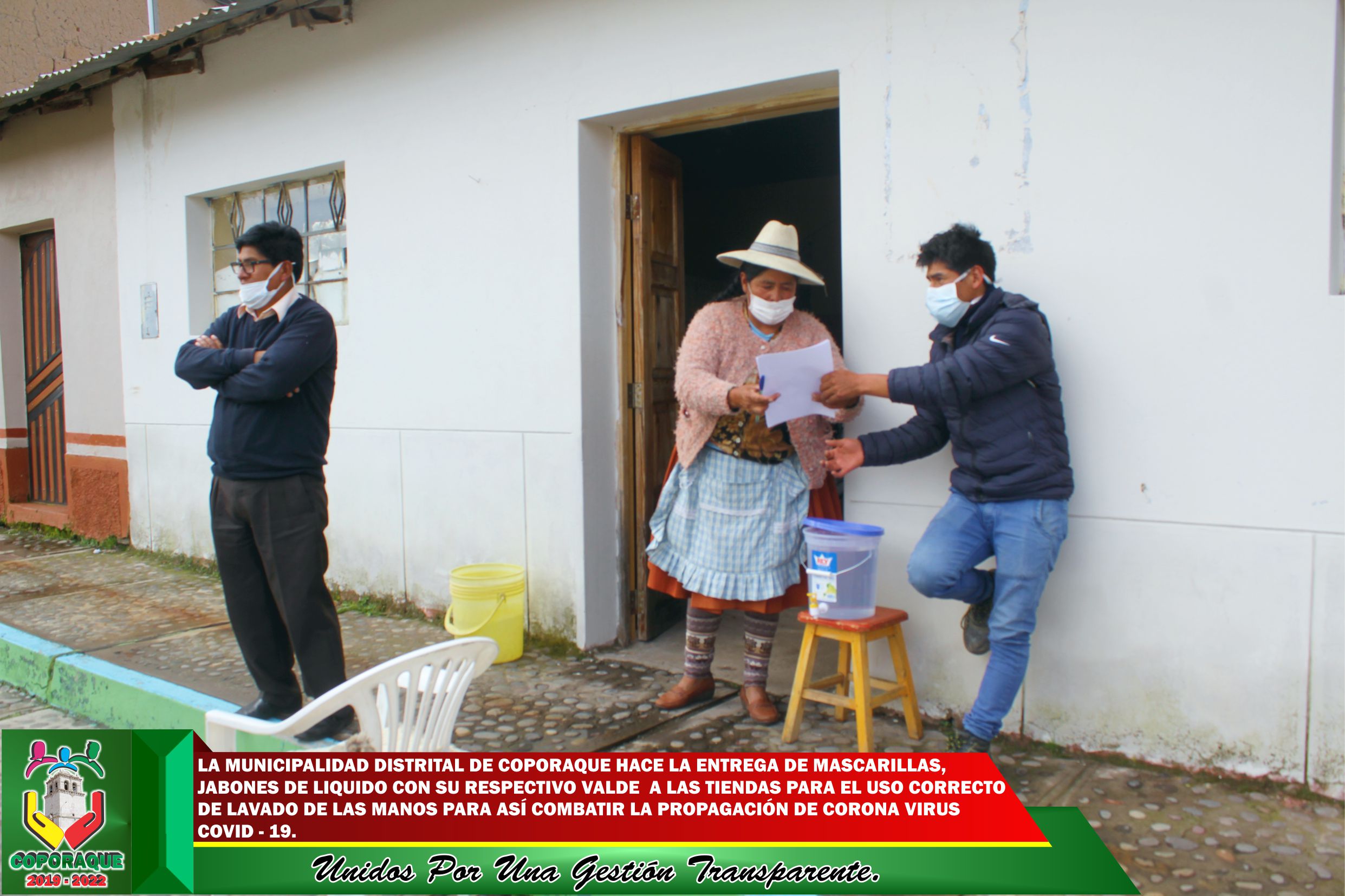 LA MUNICIPALIDAD DISTRITAL DE COPORAQUE HACE ENTREGA DE MASCARILLAS Y VALDES A LAS TIENDAS EN LOS CENTROS POBLADOS Y LA CAPITAL DEL DISTRITO,COMO MEDIDA PREVENTIVA AL COVID 19.