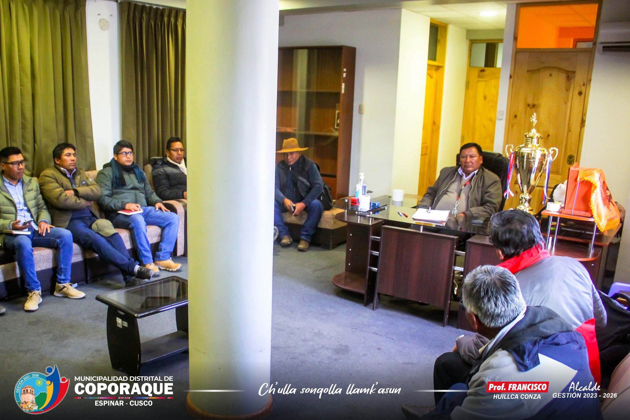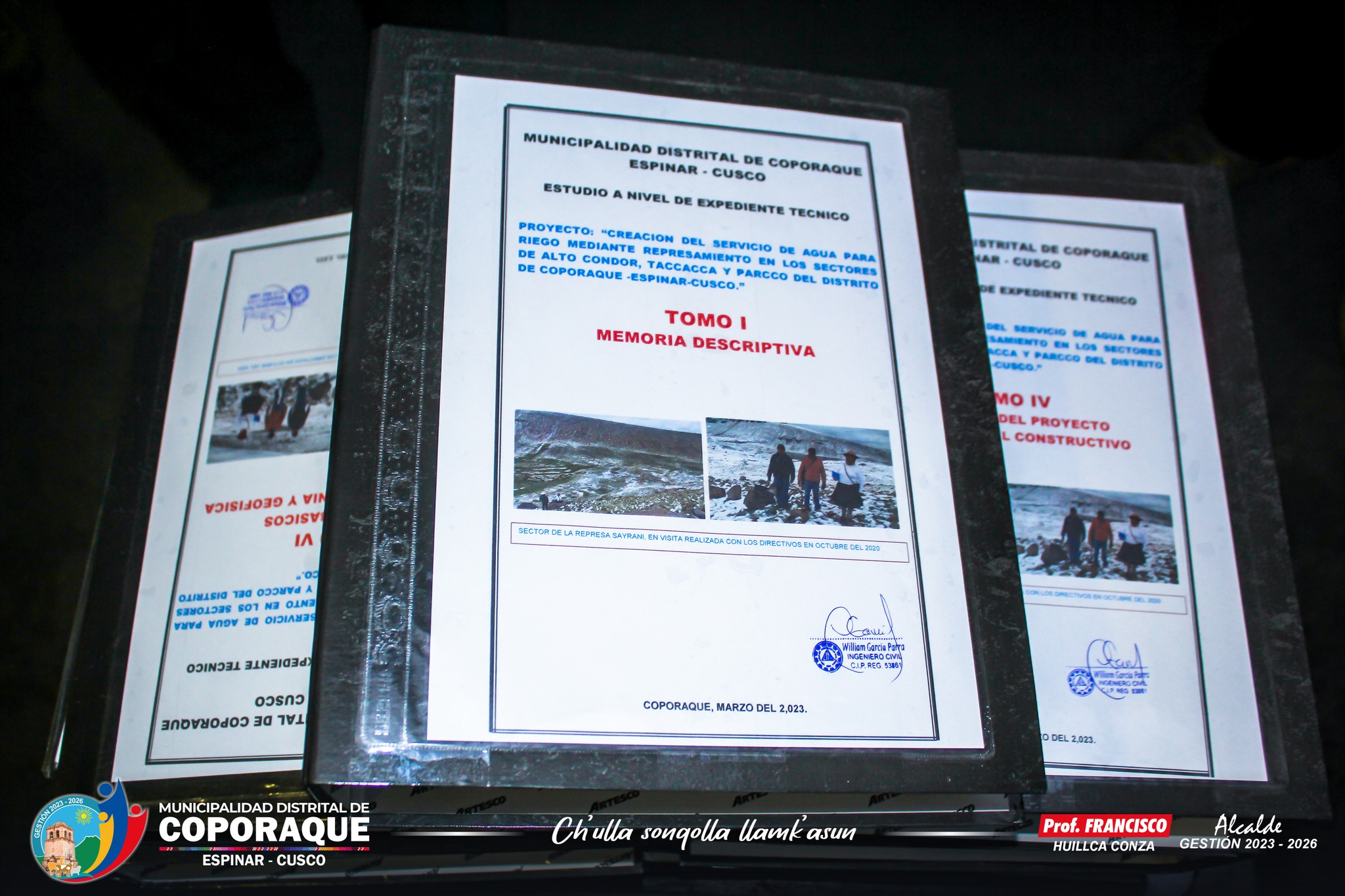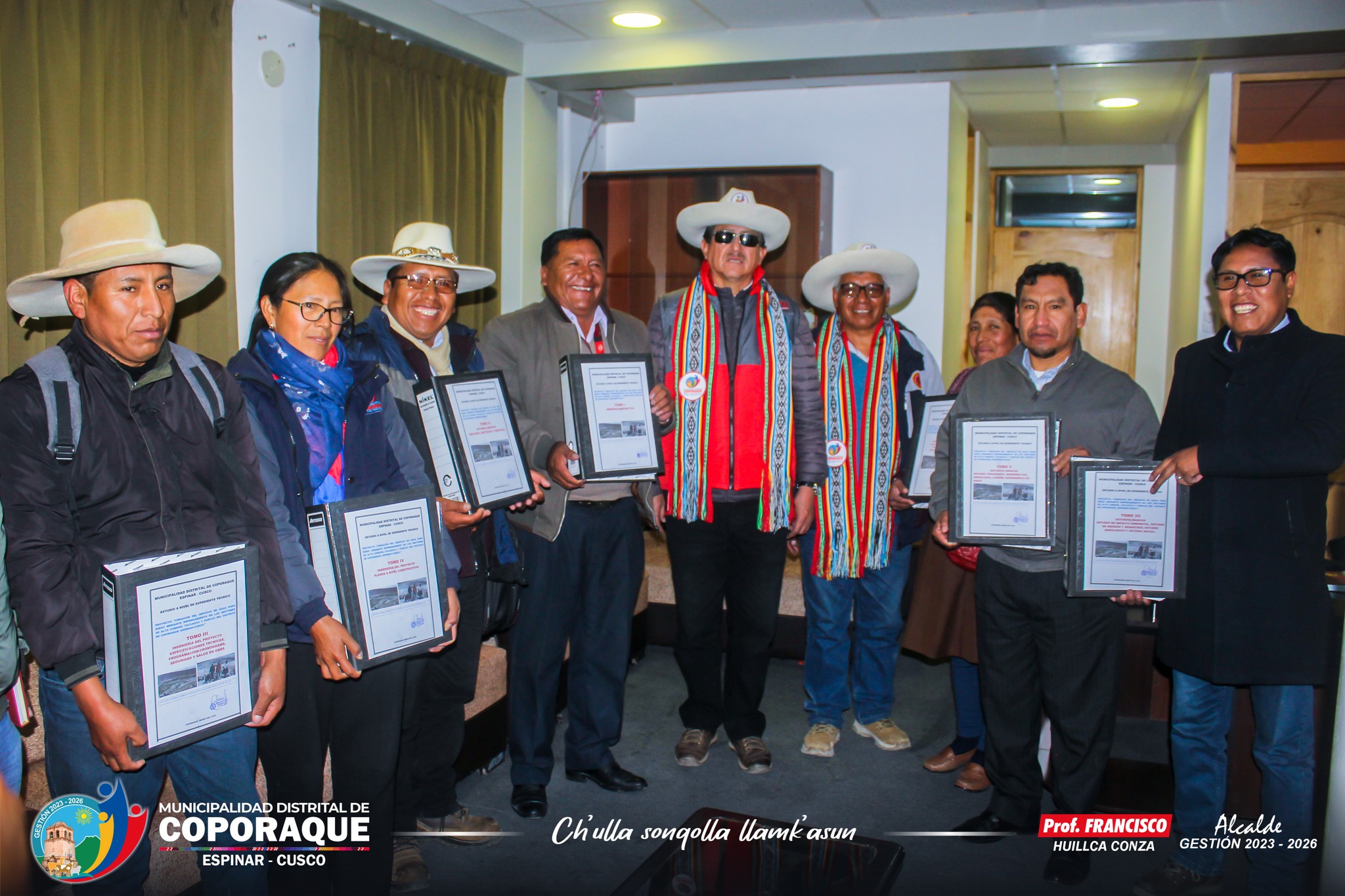 Con la presencia del alcalde de la Municipalidad Distrital de Coporaque Prof. Francisco Huillca Conza, regidores y funcionarios, el día 09 de mayo en el Palacio Municipal de Coporaque recepcionaron el expediente técnico del proyecto Alto Cóndor denominado “Creación del Servicio de Agua para el Riego Mediante Represamiento en los Sectores de Alto Cóndor, Taccacca Y Parcco Vallecito, Distrito de Coporaque, Provincia de Espinar – Cusco” dicho expediente técnico fue entregado por la empresa consultora representado por el Ing. William García Parra. Asimismo, en la recepción del expediente técnico del proyecto de Alto Cóndor estuvo presente el Ing. José Antonio Calla respresentando al Proyecto Especial Sierra Sur PESCS del Ministerio de Desarrollo Agrario y Riego (MIDAGRI), en la cual, el Ing. Calla manifestó que se buscará apoyar con el financiamiento para la ejecución del proyecto.